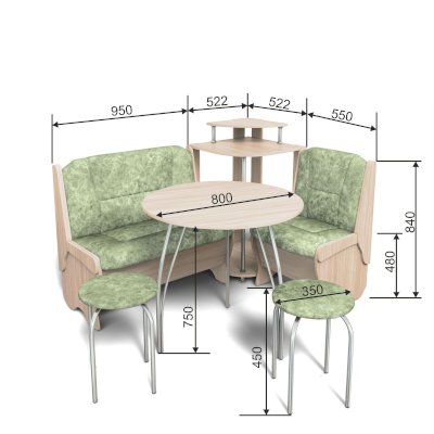 Каркас углового дивана изготовлен из ЛДСП, обработан кромкой ПВХ. Столешница кухонного набора термостойкая пластиковая, в цвет корпуса кухонного дивана.