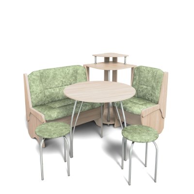 Оригинальный кухонный уголок Лотос отличается от других похожих кухонных гарнитуров. Он состоит из двух отдельных диванчиков и этажерки, заменяющей угловую мягкую часть.