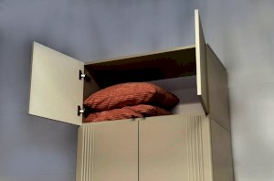 Особое внимание заслуживает фрезеровка фасадов, которая придаёт антресоли изысканный вид. Толкатели PUSH вместо ручек обеспечивают удобное открывание нажатием.